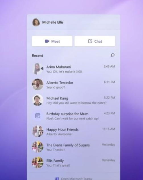 Microsoft Teams取代Skype成为Win11的默认通讯工具,与之对应的“人脉”、“MeetNow”也被一并替换。相比Win10版Skype,Microsoft Teams更加注重于团队的沟通与协同,特别是它在微软Office
