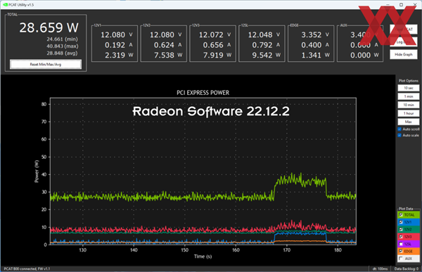 在22.12.2驱动下功耗平均是28.8W,而且曲线更稳定、平滑,波动较少。