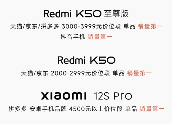 同时,还包揽了四大电商平台安卓手机品牌销量/销额全第一,妥妥的手机“一哥”。Redmi K50、Redmi K50至尊版、小米12S Pro等机型分别取得了所在价位段的单品销量第一。