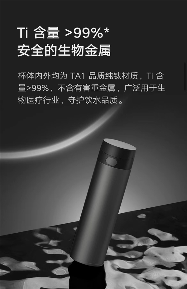 据悉,米家保温杯Ti杯体内外均为TA1品质纯钛材质Ti含量>99%,不易发生化学反应,茶、咖啡、牛奶、果汁等各类饮品都可放入杯中,不析出重金属,还具备抗菌特性。