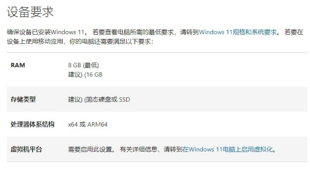 IT之家了解到,目前想要在 Win11 设备上运行 WSA 子系统还存在一定的门槛,微软官方给出的推荐运行设备配置为: