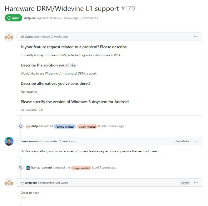 微软的工程师 Hamza Usmani 在回复“Hardware DRM / Widevine L1”帖子中表示:“这是我们已经关注到的新功能请求,我们感谢这里的反馈”。只是目前尚不清楚微软何时会上线这项功能。