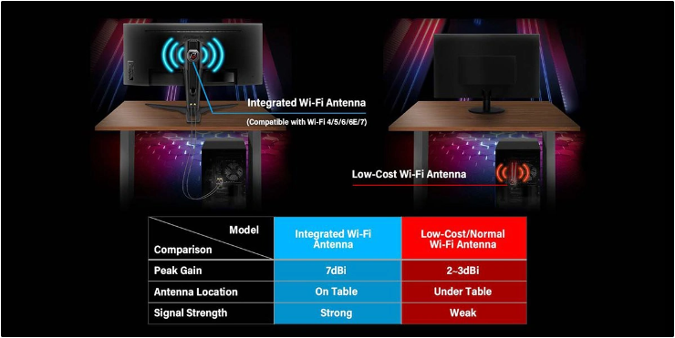 据介绍,Phantom Gaming 高阶显示器皆配备独家整合式 Wi-Fi 天线,只要将内建天线连接至个人电脑,便能防止讯号被桌面遮盖或干扰。不仅如此,天线也与 Wi-Fi 4/5/6/6E / 7 相容,提供高达 7dBi 增益,使电脑有效稳定地接收 Wi-Fi 讯号,为玩家创造无延迟且流畅的游戏体验。