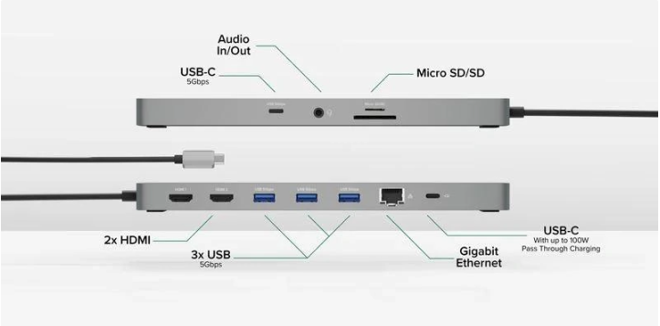 IT之家了解到,扩展坞配备六个 USB-A 端口(三个 10 Gbps、两个 5 Gbps 和一个 480 Mbps)、两个 USB-C 端口(一个 10 Gbps 和一个可为 MacBook Pro 或其它设备提供最高 100W 的充电功率)、两个 HDMI 端口、两个 DisplayPort、一个以太网端口 (2.5 Gbps)、SD 和 microSD 读卡器 (UHS-II) 以及一个音频输入 / 输出插孔。