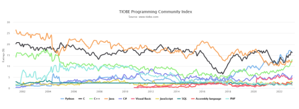 今年的亚军是第二大最受欢迎的语言 C,流行度增长了 3.82%,而排名第一的语言 Python 增长了 2.78%。Java 从第三位下滑至第四位,增长 1.55%。
