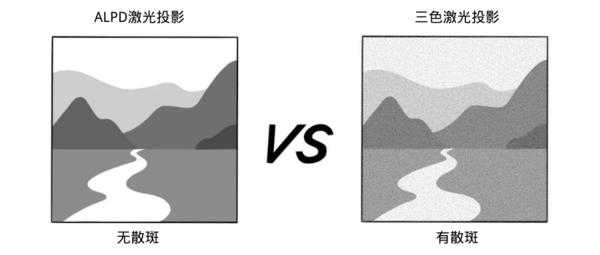 而由于三色激光技术的相干性,三色激光先天就会存在散斑问题,尤其是在选择激光投影播放时候,激光让画面显示更明亮清晰、色彩呈现更丰富多彩,但散斑却很嚣张,颗粒感的效果令屏幕画面呈现类似雪花状的斑点,画质大打折扣,让消费者头疼不已。