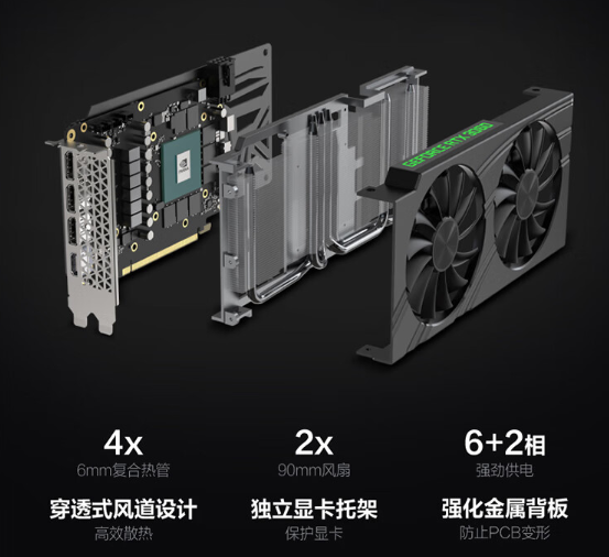 3060散热系统搭载高风量双风扇,背部镂空形成穿透式风道,配合大面积铜底保证周边热管充分导热,相较于热管直触,散热效率进一步提升。