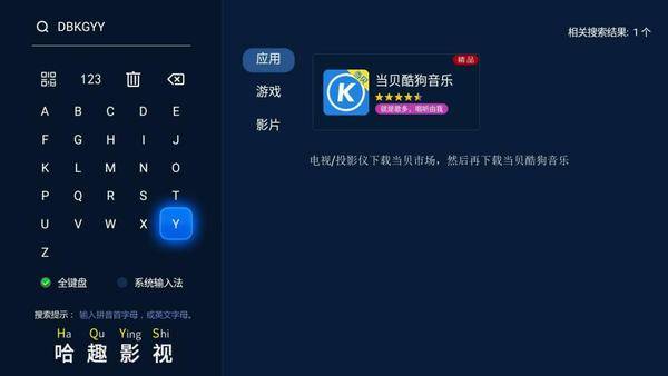4、下载完成,打开当贝市场,搜索“当贝酷狗音乐”首字母“DBKGYY”即可下载,下载完成,点击演唱会就能进入预约及观看界面。