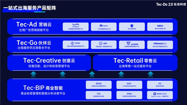 钛动科技打造了Tec-Ad营销云、Tec-Go伙伴云、Tec-Creative创意云、Tec-Retail零售云、Tec-BIP商业智能一站式出海产品矩阵,提供强大的技术保障和产品赋能广告主出海营销,使营销应用和场景更加技术化和产品化,加速广告主数字化转型,提升广告主在海外市场的竞争优势。