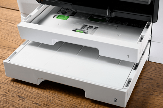 A3打印机/一体机大多是面向企业用户的,对纸张储备量要求远高于家用机型,MFC-J3940DW一共提供了两种进纸方式,以及三个不同储存纸张的地方。一个是位于机器正面底部的双层纸盒,它们分别能存放250页标准A3纸张,也就是最大能存放500张纸张。