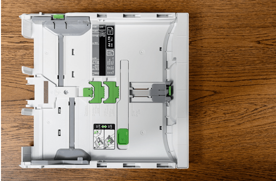 需要特别说明的是纸盒不但设有多个限位器,用于固定不同大小纸张,而且采用了伸缩设计,在默认状态,纸盒最大容纳A4纸,拉长纸盒后就可以容纳A3纸,使用起来非常灵活。