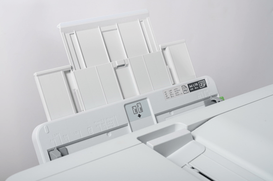 在MFC-J3940DW顶部是自动进稿器ADF,和纸盒一样它最大支持A3幅面,可以把文件送进机器内部进行扫描或是复印,最多能支持50页文件连续扫描、复制、传真等工作,而且支持自动双面扫描、打印、复印或是传真,处理大量文档时更为省时省力,最高复印分辨率为1200×2400dpi。不过需要注意的是,在使用自动进稿器时,扫描分辨率为600×600dpi。