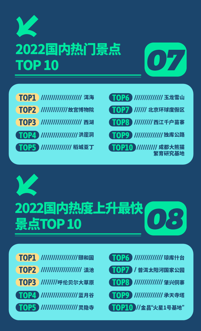 国内年度热门景点方面,洱海成为众多人心中的魂牵梦绕之地,位居榜首。故宫博物院、西湖、洪崖洞、稻城亚丁紧随其后,传说中纳西族保护神“三朵”化身的玉龙雪山吸引更多游客打卡,独库公路成为新疆境内旅行者们的必去之地。2022年,多个老牌景点翻红。颐和园、滇池、呼伦贝尔大草原占据热度上升最快景点前三。有着“小九寨沟”美誉的蓝月谷飞升至第四位,“侗乡第一寨”肇兴侗寨吸引了众人的目光,而金昌“火星1号基地”则凭借为旅行者提供最真实“火星生活”体验关注度猛增。