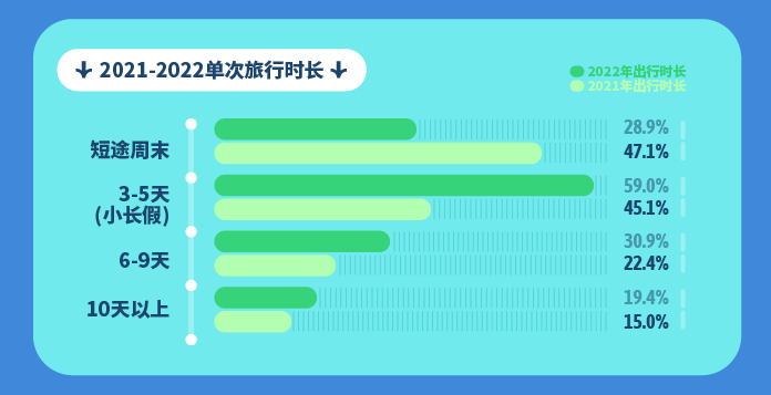 报告表明,51.5%的旅行者2022年旅行次数在2次及以上,旅行4次以上的用户仍然超过20%。67.2%的用户会在出发前半个月甚至更长时间规划旅行行程。整体来看,用户的单次旅行时长增加显著,主要集中在3-5天,占比达到59%,同比增长13.9%。此外,单次旅行时长在6-9天及10天以上的比列也都有所上升,分别提高8.5%、4.4%。