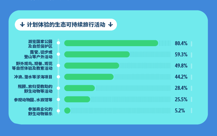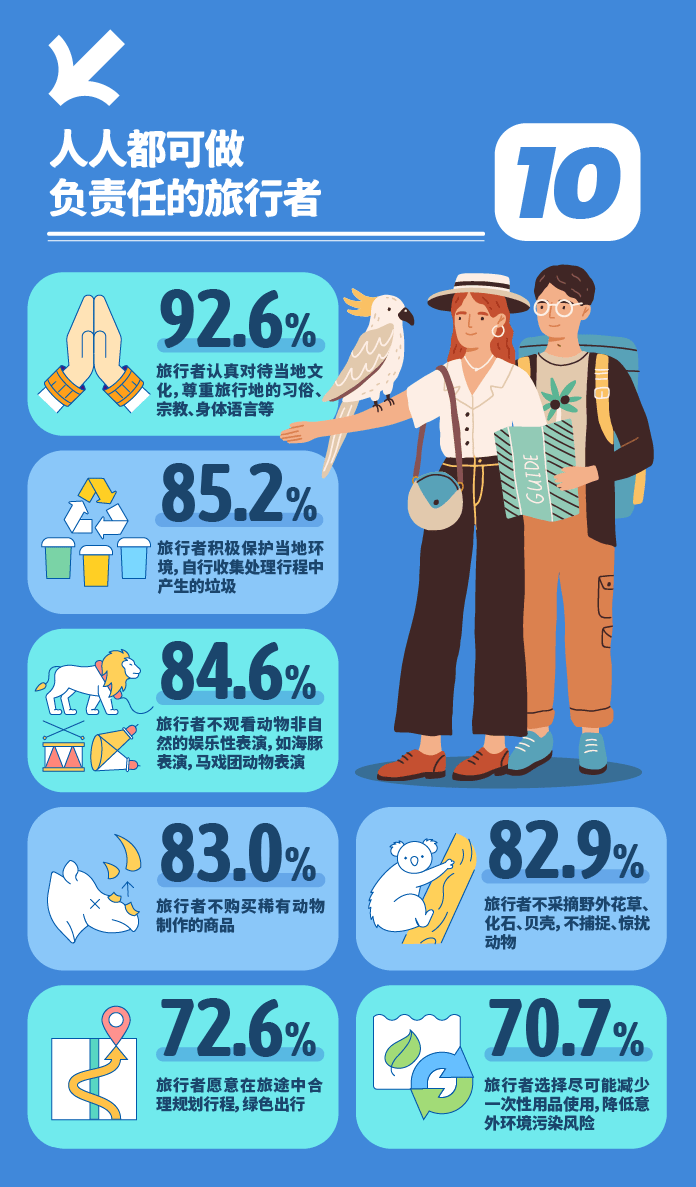 旅行者们积极践行负责任的旅行,92.6%的旅行者认真对待当地文化,尊重旅行地的习俗、宗教、身体语言等,85.2%的旅行者积极保护当地环境,自行收集处理行程中产生的垃圾,83%的旅行者不购买稀有动物制作的商品,84.6%的旅行者不观看动物非自然的娱乐性表演,如海豚表演,马戏团动物表演,相较于去年提升16.8%。