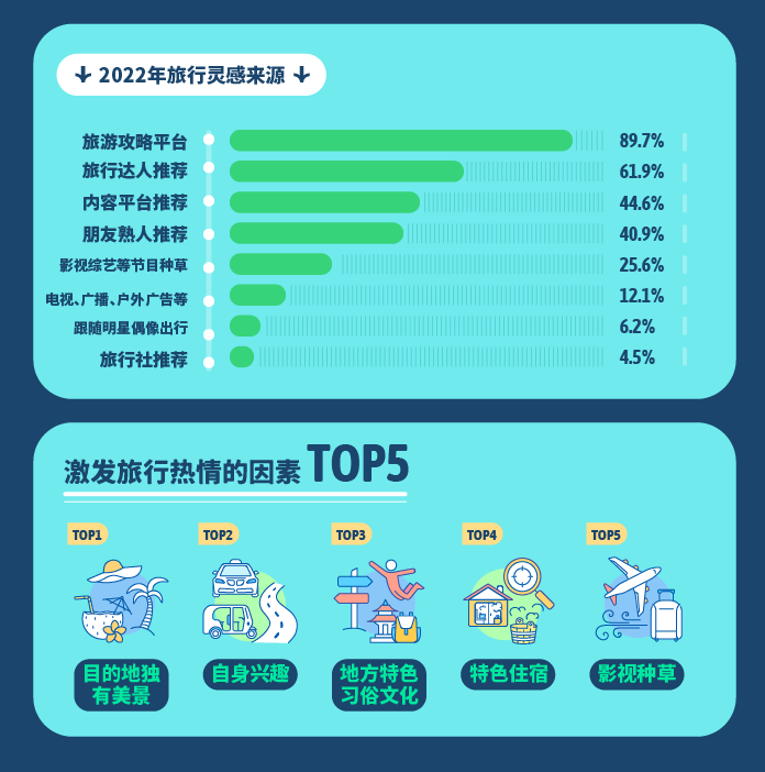 当下的生活分享平台多样,但对旅行而言,旅行攻略平台、旅行达人依旧最能带来旅行灵感,占比分别高达89.7%、61.9%。而真正激发旅行者出行的因素,更多来自目的地独有美景,其次是根据自身兴趣出发,地方特色习俗文化、特色住宿、影视种草分列3-5位。