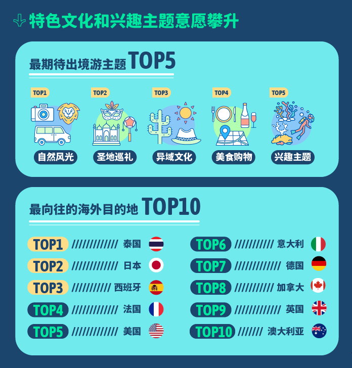 报告显示,自然风光、圣地巡礼、异域文化、美食购物、兴趣主题是穷游er最期待的出境游主题。其中,对特色文化、兴趣主题的意愿上升明显,领略不同国家的风土人情,或者从自身兴趣出发,去海外的攀岩、冲浪等圣地成为越来越多人的选择。而2023年用户最向往的海外目的地,泰国、日本、西班牙、法国、美国、意大利、德国、加拿大、英国、澳大利亚分列前十。