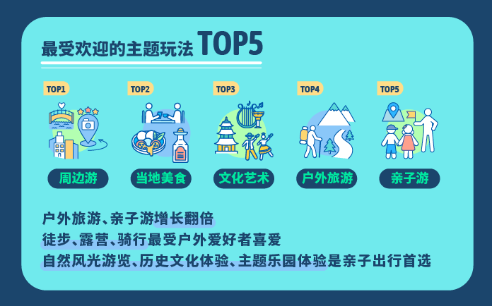 旅行应该怎么玩?穷游er们给出了各自的答案。过去的一年,周边游、当地美食、文化艺术、户外旅游、亲子游成为旅行者们最中意的主题玩法。值得注意的是,亲子游首次进入TOP5,成为更多有孩家庭的选择,自然风光游览、历史文化体验、主题乐园体验是亲子出行的首选。此外,户外游的增长显著,徒步、露营、骑行备受户外爱好者喜爱。