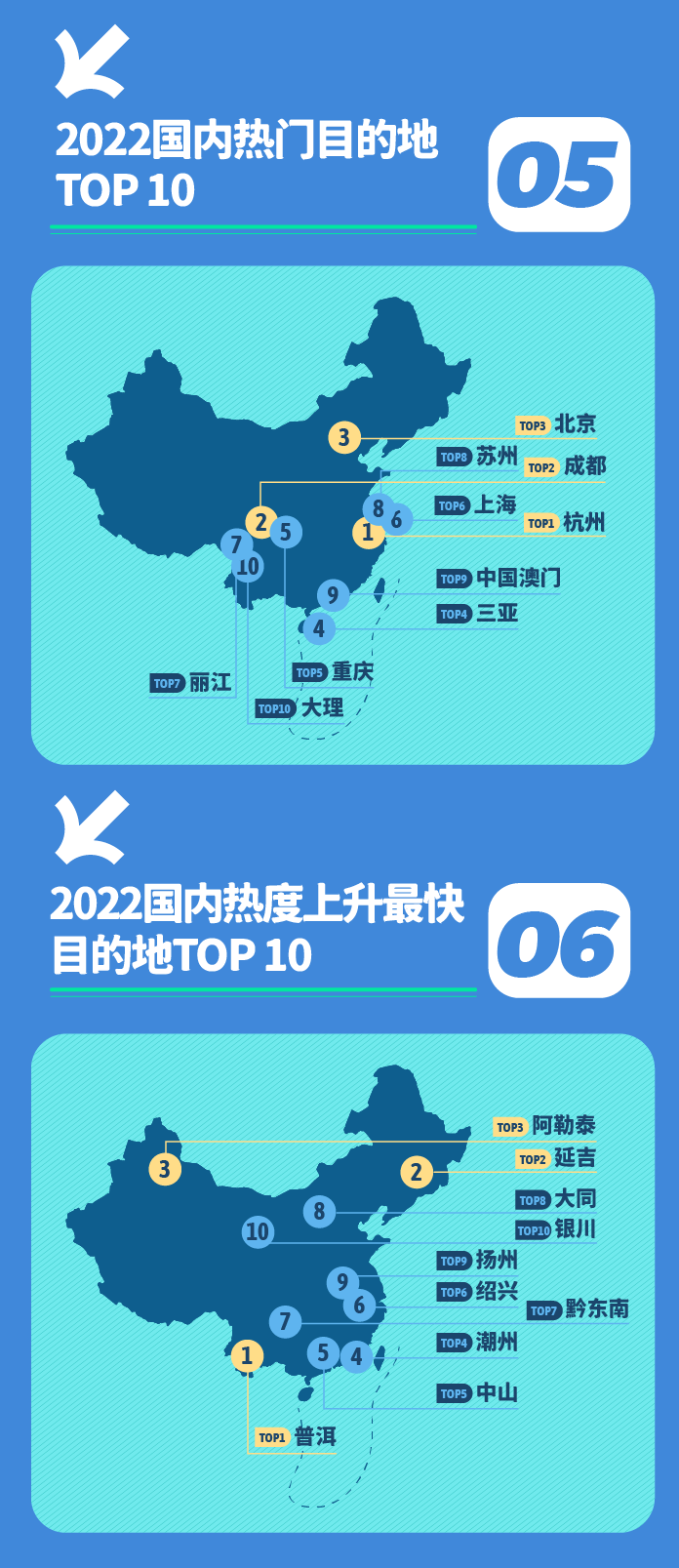 国内年度十大热门目的地,杭州、成都、北京位列前三,但另有一批目的地成功抓住了旅行者的目光。有着“高原姑苏”之称的丽江,独占两个“中国四大园林”的苏州,“世界美食之都”澳门及无数人心中“诗与远方”的大理均榜上有名。除了这些大众熟知的目的地,今年也有众多国内宝藏目的地被旅行者们所探索。冬无严寒,夏无酷暑的普洱登顶国内热度上升最快的目的地,拥有无数正宗朝鲜族美食的延吉被更多人熟知,位列第二。潮州不只有美食与茶,还凭深厚的历史文化吸引着人们前往,分布着48个少数民族的黔东南为旅行者们提供了无限的文化体验。