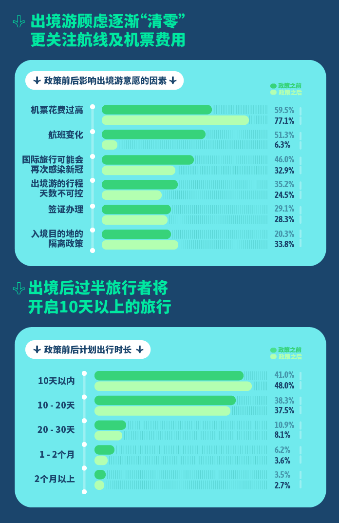 连日来各国对中国游客的入境政策备受关注,这也同此次报告的结果不谋而合。旅行者除对机票费用过高持续关注外,航班变化、出行后感染新冠已不再成为他们当下最关注的问题,对入境目的地隔离政策的担忧上涨13.5%,达到33.8%,位居第二位。
