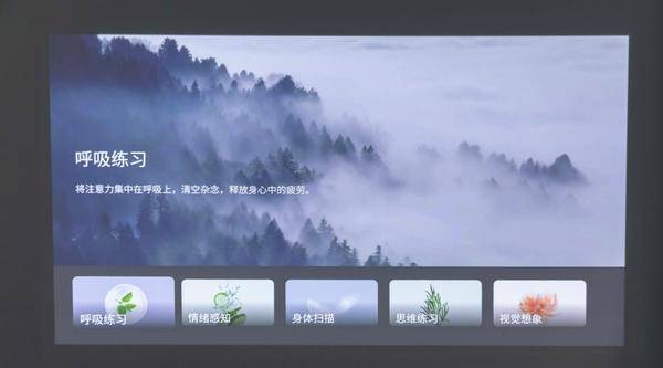 除了用于观影、玩游戏外,当贝OS系统还支持“氛围模式”,在此模式下可以按照自身的喜好选择壁纸或氛围主题,模式可分为“氛围”、“冥想”、“音乐”三种模式,用于打造多场景主题模式,如在音乐模式下可以把画面当成一个背景墙,氛围模式下可以选择多种生活场景,以便在不同的场景下感受不同的气氛,满足不同场景下的玩法。