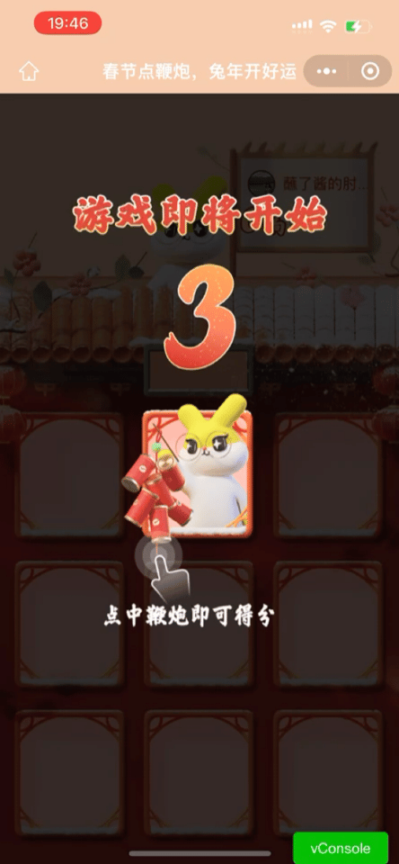 游戏开始后,兔小北的小伙伴们会从窗户里伸出鞭炮,30秒内用手指点鞭炮,点中即可得分,根据游戏结束的得分,可收获相应的提现免费券奖励。