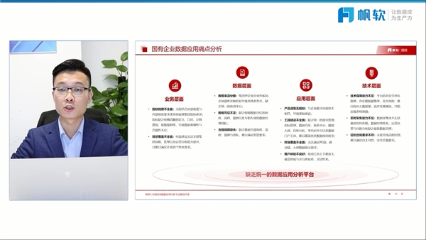 帆软国资事业部总经理杨新伟也介绍了帆软在国资数据平台建设标准化的经验。帆软采用挂图指挥、上屏作战、业务仿真到数据孪生四步走的总建设路径,为客户提供一条龙的数据应用分析服务。帆软正以大数据分析工具为基础,向“数据应用服务商”稳步前进。