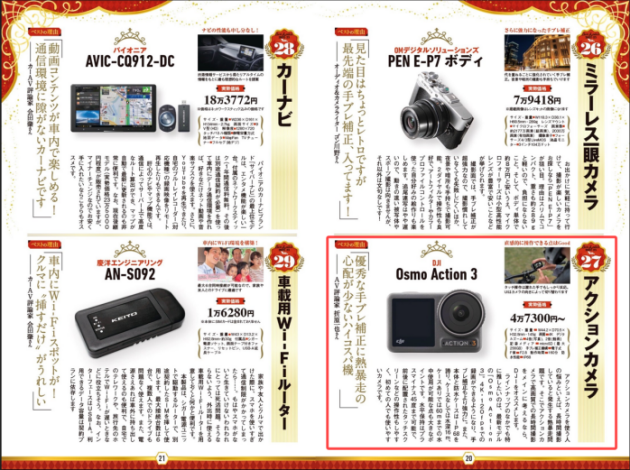 在日本,大疆Osmo Action3被电器生活用品导购《MONOQLO》杂志评为“Best Buy of the year 2022”(年度最佳选择),被《日用精品情报》杂志评为“Best Value products in this winter 2022”(2022年冬季最有价值产品)。