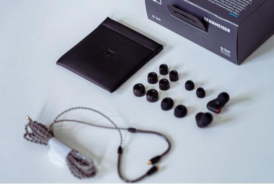 IE 200 虽然是新成员,但它融合了 IE 系列诸多鲜明的特点与优势。包装上与前几代相同,IE 200 采用了森海塞尔家族式的设计风格,黑、灰、蓝的配色使其沉稳中又不失时尚感。打开包装抽出内盒,可以看到耳机本体和配件。
