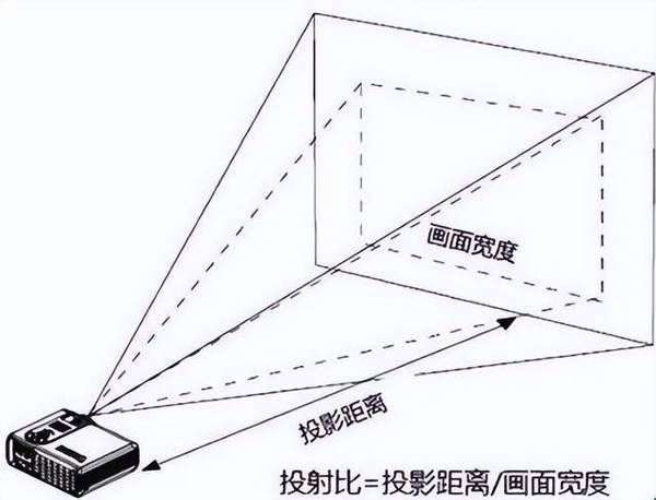 投射比为投影距离与画面宽度之比,比值越小,说明相同投影距离,投射画面的宽度越大。