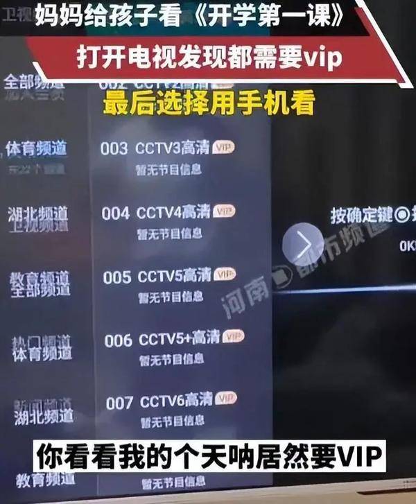 去年9月开学季,湖北天门一位妈妈打开电视一看,不管看有线电视的哪个频道都需要VIP,觉得非常不合理,又没有办法。捯饬半天后,还是拿手机给孩子播放了《开学第一课》。