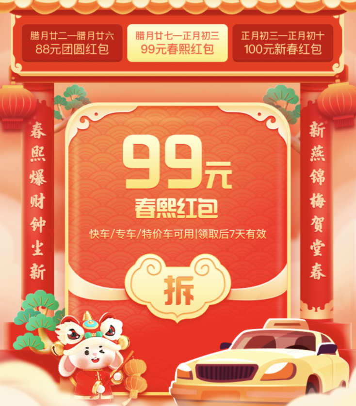 追公交、挤地铁赶车是不是时间不够?串门拜年没有直达公交,打车又怕等太久?打车频繁花销太大?不用担心,百度地图打车的“团圆有你,春熙大吉”新春出行福利来了,即日起,点击百度地图打车“团圆有你,春熙大吉”弹窗进入活动页面参与,即可在不同节日时段领取不同额度打车春节专属消费券。