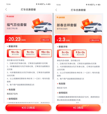 活动二:百度地图发放节日特惠券,助力用户舒适回家过年。在“大吉套餐”页面,用户可抢购“新春吉祥套餐”、“福气百佳套餐”等特惠包,用更实惠的价钱兑换到更高额的抵扣券与打折券。