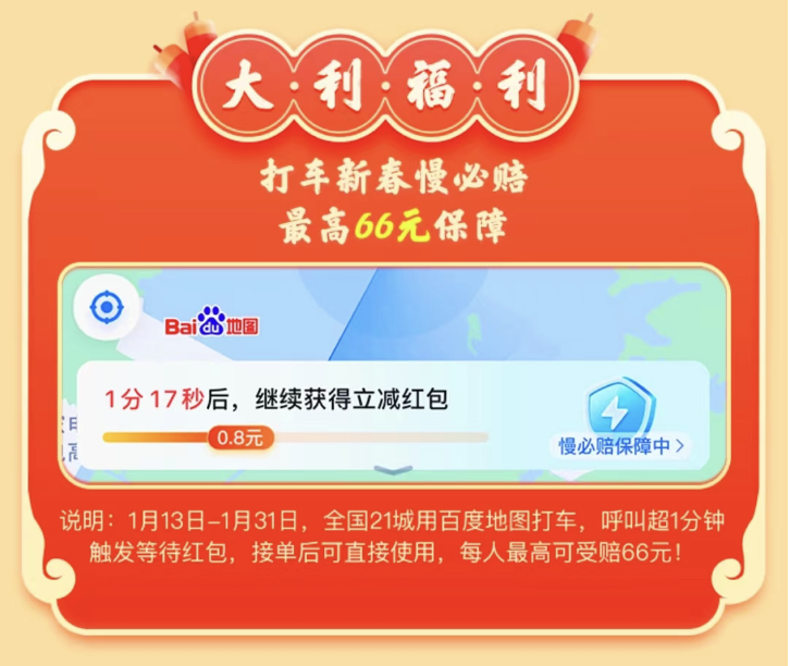 活动三:百度地图推出春节打车慢必赔保障,在为大家出游提供快车、优享、特惠等多样用车服务选择的同时,让打车等待不再成为负担。此外,在“大利福利”页面,大家可以领取打车等待红包中,而在呼叫打车页面,也可直观看到“慢必赔”保障排队时间进度条,当超过相应排队等待时间,即可获得立减红包。