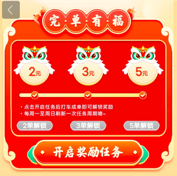 活动一:在“完单有礼”页面点击“开启奖励任务”按钮后,即可参与完单有礼活动,完成对应数量的打车成单即可领取相应金额打车券。