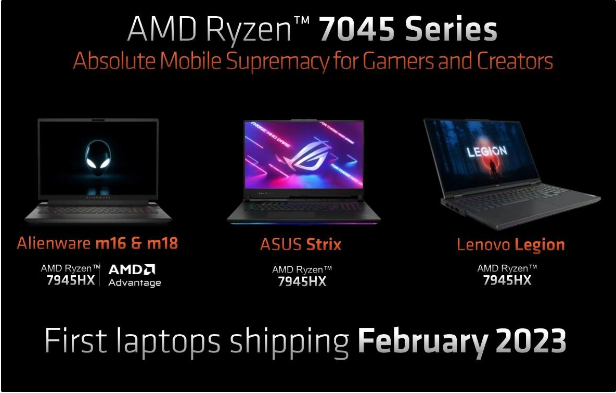 搭载 AMD 锐龙 7045HX 系列处理器和 RX 7000 独显的笔记本也将在 2 月开始上市,具体上市时间暂未公布。AMD 锐龙 7045HX 系列处理器也是桌面移植而来,最高 16 核 32 线程。