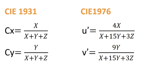 每一种颜色的曲线积分得到一种刺激值,就是常见的X,Y,Z(三刺激值)的数值,通过如下CIE1931或CIE1976的转换公式,得到为人所熟知的(Cx,Cy) 或者是(u’, v’)。