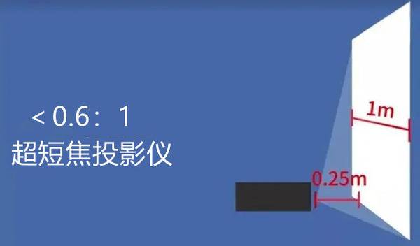 投射比>1的称为长焦投影仪,一般中长焦投影仪的投射比基本上是在1.2:1左右;<1的称为短焦投影仪,对超短焦投影仪的定义是投射比要<0.6,而激光电视的投射比也是<0.6这一数值,因此也就更加确定了激光电视是超短焦投影仪的事实。