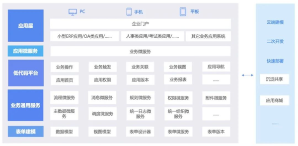 通过蓝凌低代码平台,组织及企业可打造自己专属的技术PaaS服务、业务中台,基于平台提供的组织服务、主数据服务、集成中心、BPM、表单引擎等中台服务模块,无需大量专业研发人员和技术投入,降低企业应用开发门槛,并可通过API接口可打通企业原有系统,实现企业全面的数字化升级。