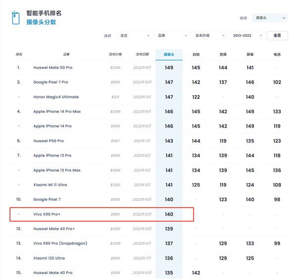 其获得了140分的总分,在DXOMARK摄像头全球榜中排名第十位,与谷歌Pixel 7并列,略高于小米12S Ultra。
