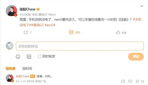 据realme真我手机官方最新发布的信息显示,与此前曝光的消息基本一致,全新的真我GT Neo5将全球首发240W满级秒充,宣称“手机闪充进入读秒时代”。同时realme副总裁徐起表示,真我GT Neo5在没电的情况下,仅需充电30秒就能在线观看1小时电视剧《狂飙》,简直开挂一般的存在。之所以拥有以上表现,主要得益于该机首发的240W充电架构、12A定制充电线以及240W双GaN迷你充电器,不到10分钟就能将内置的4600mAh电池充至100%,其闪充技术堪称“捅破天”。