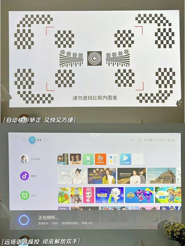 当然当贝OS里面还有很多有趣又使用的功能,里面有自动无感对焦、全向梯形校正功能,不能手动校正,能够自动快速的对焦调整出方正的画面,如果家里有幕布,以及杂物多,还能使用上,智能避障以及幕布自适应的功能,平时使用起来很方便。
