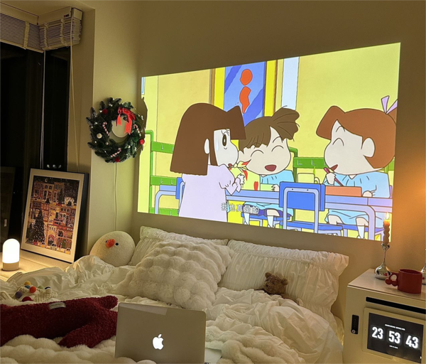 投影仪最主要的还是讲画质,画质怎么看,这里教大家几点,首先就是看亮度,分辨率其次就是有没有画质增强技术,运动补偿技术等等。像当贝D5X配置的1100ANSI流明的亮度就很合适,这个亮度不搞也不低,平时在房间看灯看效果也很好,关灯看电影效果更佳;下面是当贝D5X在卧室开灯场景的真实画面,这房间有光线的情况下,画面色彩和亮度丝毫不受影响,学生党长时间看也不伤害眼睛。