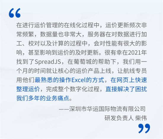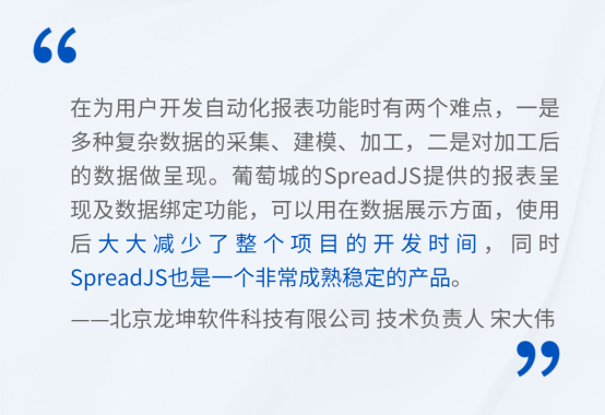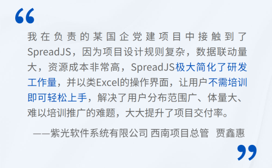 数十年如一日的精耕细作以及对行业的理解沉淀,匠心打磨出工匠级别的产品与技术,也得到了众多开发者的肯定和信赖。会上,众多技术大咖分享了在产品选型过程中的考量,在比较了市面上众多同类表格产品之后,最终基于功能强大、性能稳定、场景丰富、服务完善等选择了葡萄城的SpreadJS表格控件,不仅解决了关键的技术难题,让软件性能得到了很大突破,也为自身业务带来了更多发展。