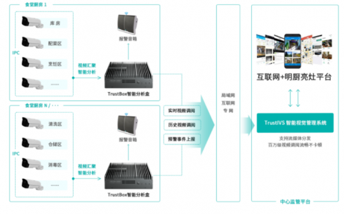 亚略特“互联网+明厨亮灶”智慧解决方案由前端监控设备+边缘计算单元TrustBox®+可视化智能管理平台组成。其中TrustBox可接入市面上主流厂家生产的视频及图像采集终端设备,兼容原有的监控环境,快速完成智能监控升级,可利旧、可新建,相互独立,互不影响。