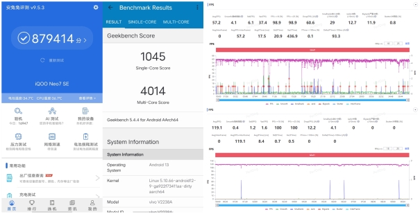 数据显示,iQOO Neo7 SE的安兔兔跑分成绩来到879414,CPU单核成绩为1045,多核成绩则是4014。体现到游戏场景中,iQOO Neo7 SE运行原神挺轻松,平均帧率可以达到57.2,更是实现了119.1的王者荣耀平均帧率。毫无疑问的是,iQOO Neo7 SE能够满足我们对大型游戏的畅玩需求,高帧率更是不在话下。