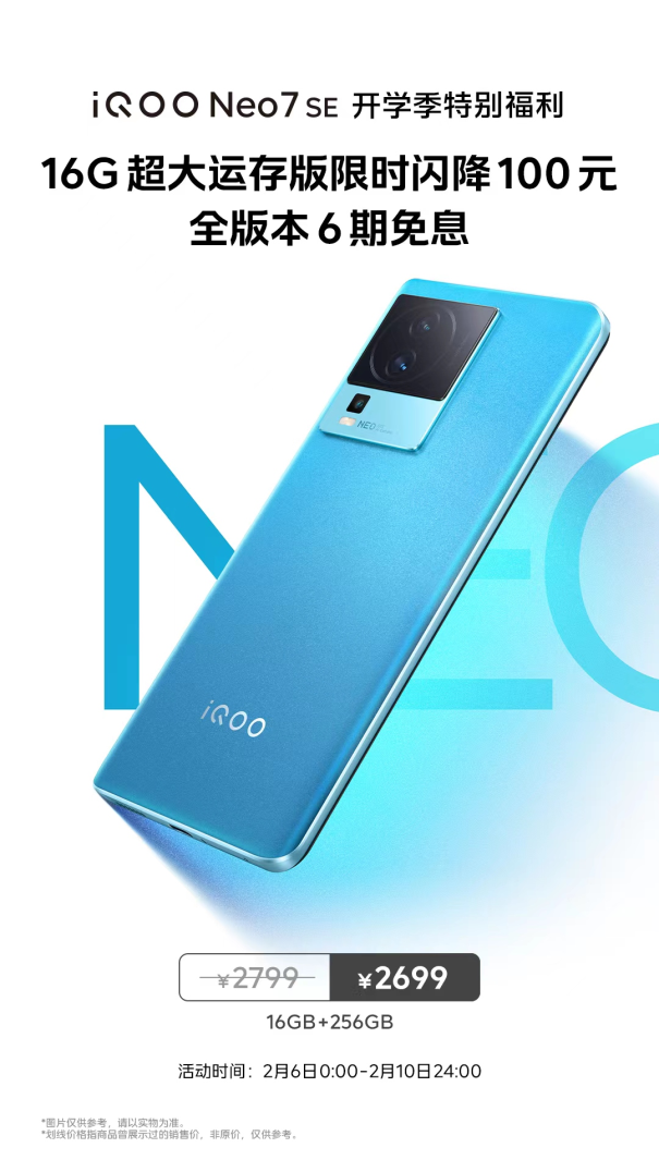 现阶段,iQOO Neo7 SE的开学季特别福利来了。这款手机全版本享受6期免息分期,16GB+256GB版本限时直降100元,下单8GB+256GB和12GB+256GB版本可以立省30元。