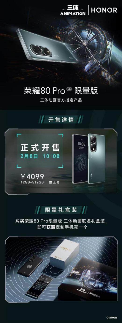 2月8日10点08分,荣耀80 Pro限量版三体动画联名礼盒正式开售。作为三体动画官方指定产品,这款荣耀80 Pro多维度融合三体动画元素,不仅包括定制款礼盒、手机壳等精美礼品,还特别打造专属开机动画、音效以及手机UI、桌面壁纸等内容,为荣耀粉丝与三体迷们献上一份科技与科幻的联动好礼。