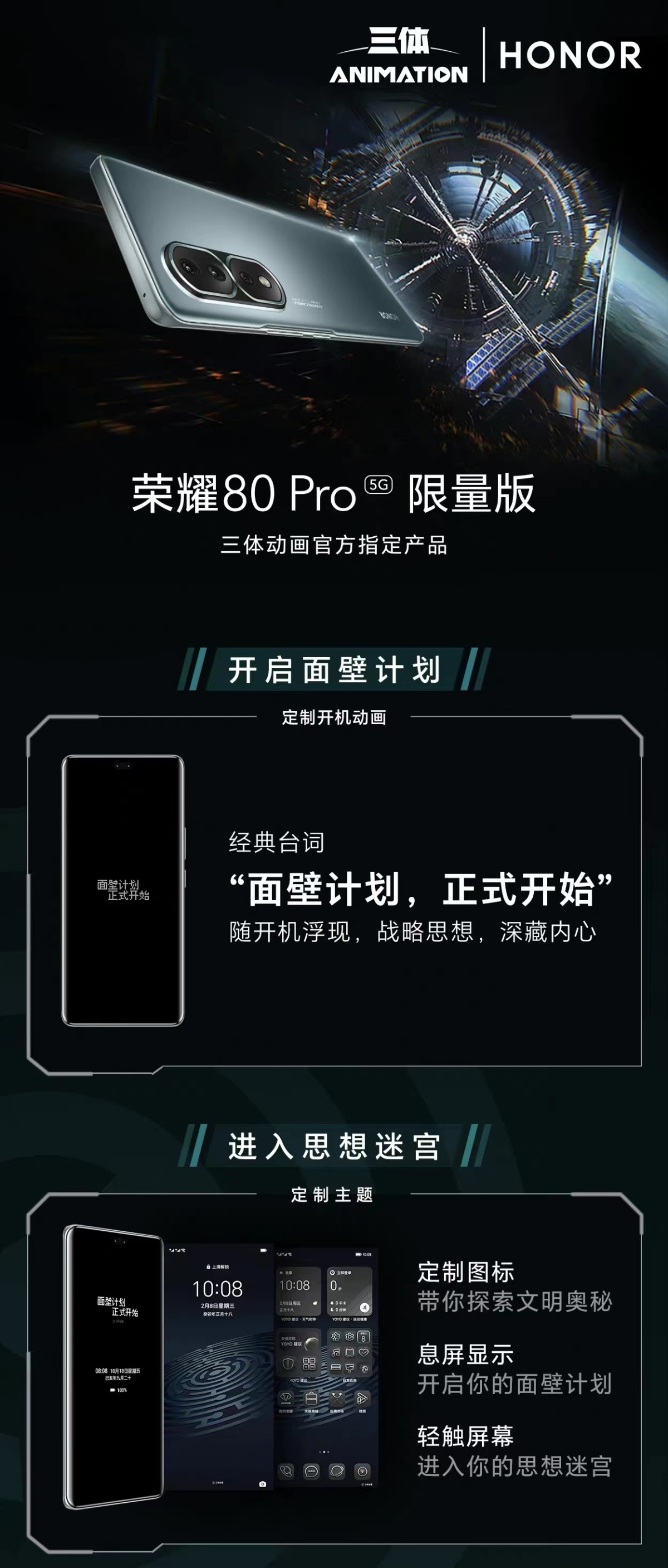 一直以来,荣耀数字系列都围绕年轻人的用户需求持续创新,致力于为年轻人带来更美好的生活体验。通过这次科技产品与科幻影视作品的梦幻联动,荣耀80 Pro也让科技与科幻爱好者对双方有了更大的想象空间。今日10点08分,荣耀80 Pro限量版三体动画联名礼盒正式开售,开启火爆抢购,感兴趣的朋友请不要错过入手良机!