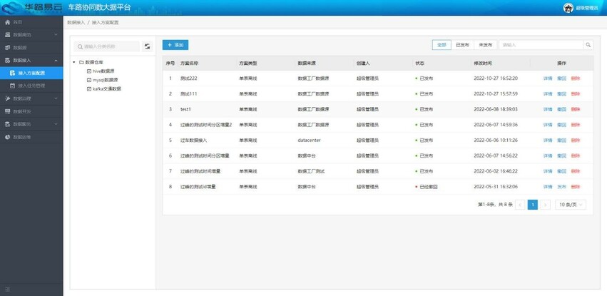 车路协同应用的关键在于对海量数据的实时处理和数据价值的挖掘,华路易云车路协同大数据基础平台采用多集群架构,构建标准化的“海量数据加工厂”,建立涵盖从数据接入到数据处理、数据治理、数据组织、数据服务的全过程功能体系,打造车路协同应用的数据底座。